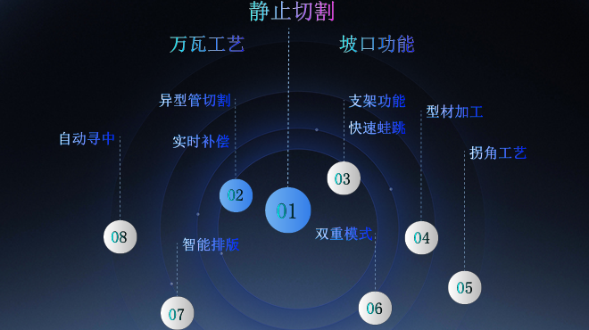 支持飛行切割,蛙跳,引刀線,冷卻點、相貫孔、刀珞排序 自動排樣、焊縫補償、模擬切割、微連,預穿孔,自動調(diào)焦 一鍵切斷等多種工藝